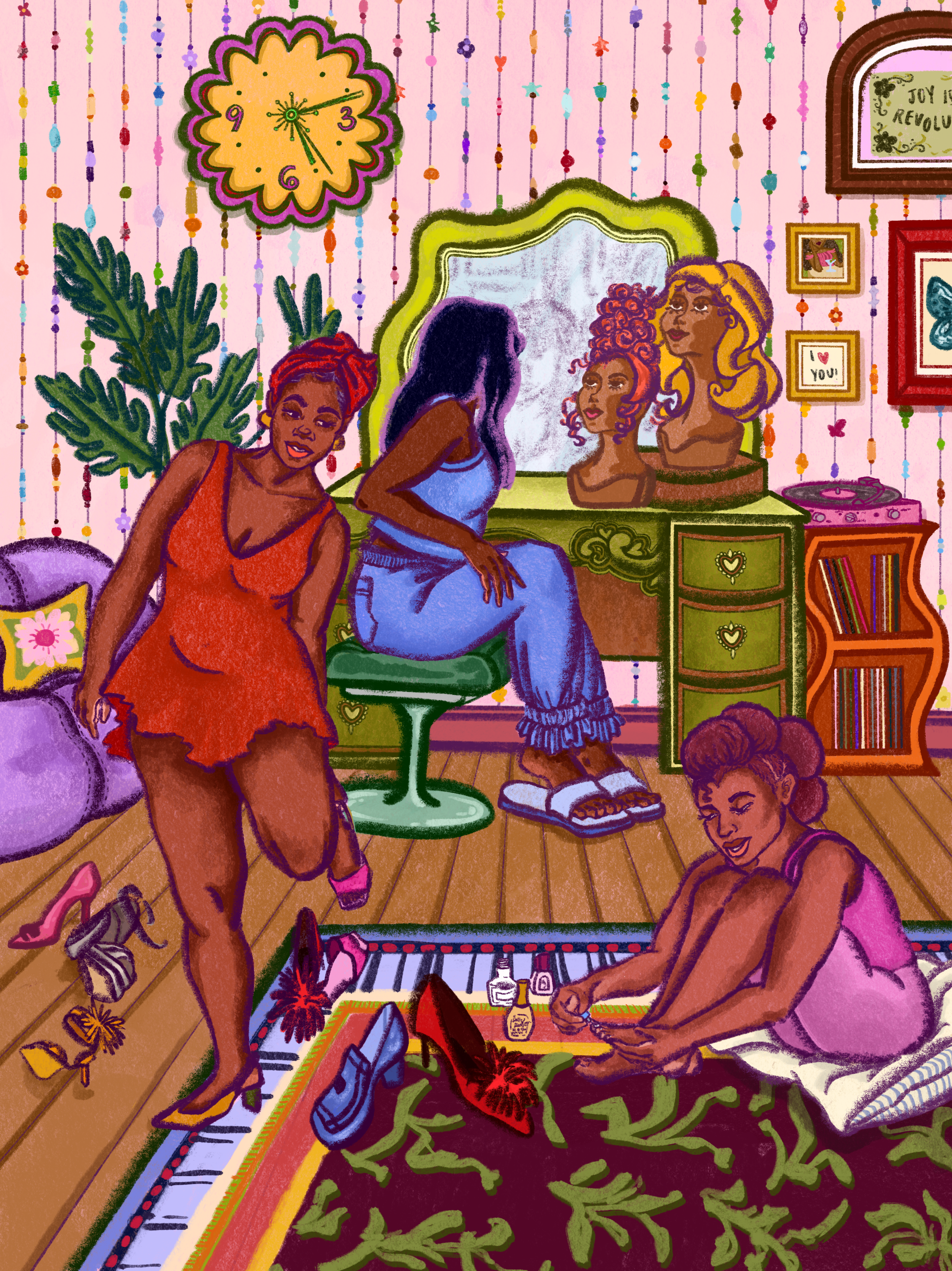 three ladies, one holding a plant, one sitting down, the last one dancing, stare at an open suitcase overflowing with clothes. stop signs and roads signs loom in the background